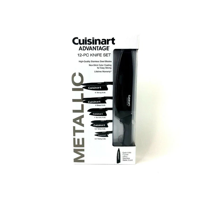 El juego de cuchillos Cuisinart® Advantage® de 12 piezas con protectores de hoja cuenta con filos de acero inoxidable de calidad profesional con revestimiento antiadherente que facilitan aún más el corte y mantienen las hojas afiladas por más tiempo. Estos elegantes cuchillos incluyen protectores de hoja a juego para la seguridad de su familia.
